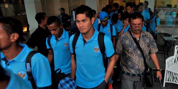 Pemain Timnas Sepakbola meninggalkan Hotel Saka untuk menumpang bus menuju Bandara Internasional Polonia Medan, Selasa (29/1/2013). Timnas akan bertolak ke Jordania untuk laga ujicoba.